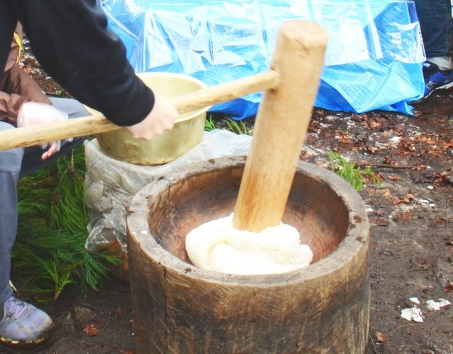 もち米を蒸して臼(うす)と杵(きね)という道具でねばりがでるまでついて作る「おもち」。スーパーなどでは1年を通して売っていますが、日本では「お正月」に食べることが多いです。
