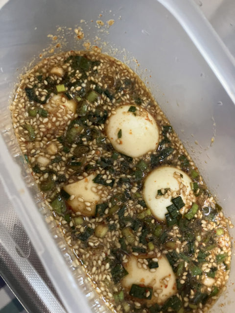 じつはこの味玉、ネットで話題になった「麻薬卵」と少し似たレシピだと最近気づいたため、今回初めて作ってみました。ご飯の上で半熟の味玉を割りつつ、つけダレを追加で少しかけたらとってもおいしいです! お好みで辛さを調整できますし、すりおろしたニンニクを加えてもおいしいので一度試してみてください!