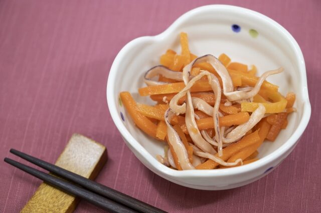 スルメイカとにんじんを細く切ったものを醤油とざらめで甘辛くしたおかずです。ご飯のお供やお酒のおつまみとして100年以上前から食べられていて家庭によって味付けが変わります。