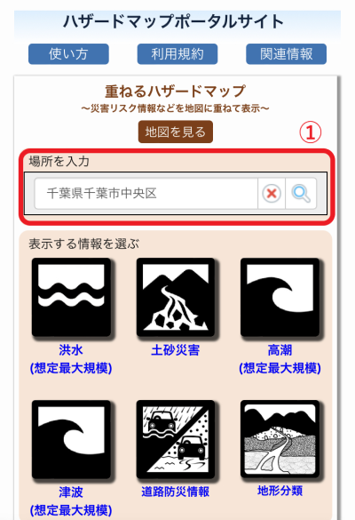 上記URLにアクセスして、知りたい場所を検索します(①)