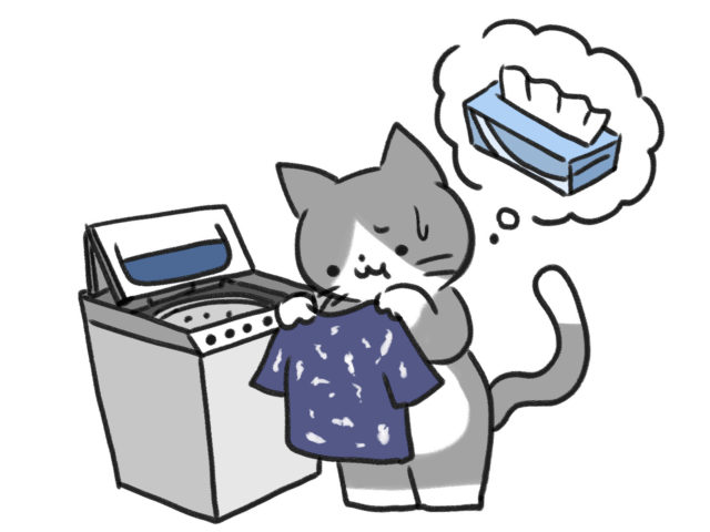 いったんティシュまみれの衣類を洗濯機から取り出し、お風呂場でさっと払ってティッシュを軽く落とし、洗濯機の内部と糸くずフィルターのティシュを取り除いてから洗濯物を洗濯機に戻し、柔軟剤の投入口に規定量の柔軟剤を入れて、すすぎ1回・脱水1回にセットしてスタート!多少は残ってしまうだろうな、と思っていたのですが終わってみたらアラ!ビックリ!ほぼ気にならないくらいにティッシュが取れていました。黒い衣類は少し気になったので、乾いてから粘着テープ(コロコロ)を使いましたが、本当にきれいになっていたので安心しました。もちろん終わった後は洗濯機と糸くずフィルターの中を掃除して終了。洗濯機の中が気になる場合は、空の状態で水をいっぱいにまでいれて、すすぎと排水を行えばさらにOKです。もし皆さんにも同じことが起こったら、この方法を思い出してもらえるとうれしいです。