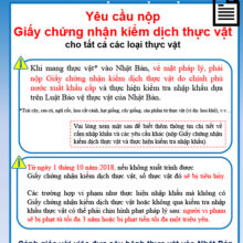 Từ ngày 1 tháng 10 tất cả các loại thực vật khi mang vào Nhật Bản phải có giấy chứng nhận đã được cơ quan chính phủ nước mình cấp phát giấy chứng nhận đã kiểm tra và phải làm thủ tục kiểm tra khi nhập khẩu. Đơn giản hóa thì bao gồm các loại trái cây, rau, ngũ cốc… hay các sản phẩm đã …