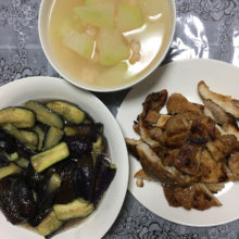 Phóng sự về bữa cơm lần này là món xào nha. 【Thực đơn】 Thịt lợn xào Cà tím xào Canh súp bí xanh Hình như thịt lợn xào dùng bằng sốt thịt nướng thì phải. Cà tím được xào với dầu ăn. Mùa thu là mùa cà tím ăn rất ngon nên ở Nhật có câu tục ngữ thế này. 「Đừng ăn cô dâu như …