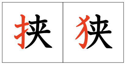 Ví dụ: 狭小 (kyouchou – chật hẹp), 狭量 (kyouryou – hẹp hòi), v.v…